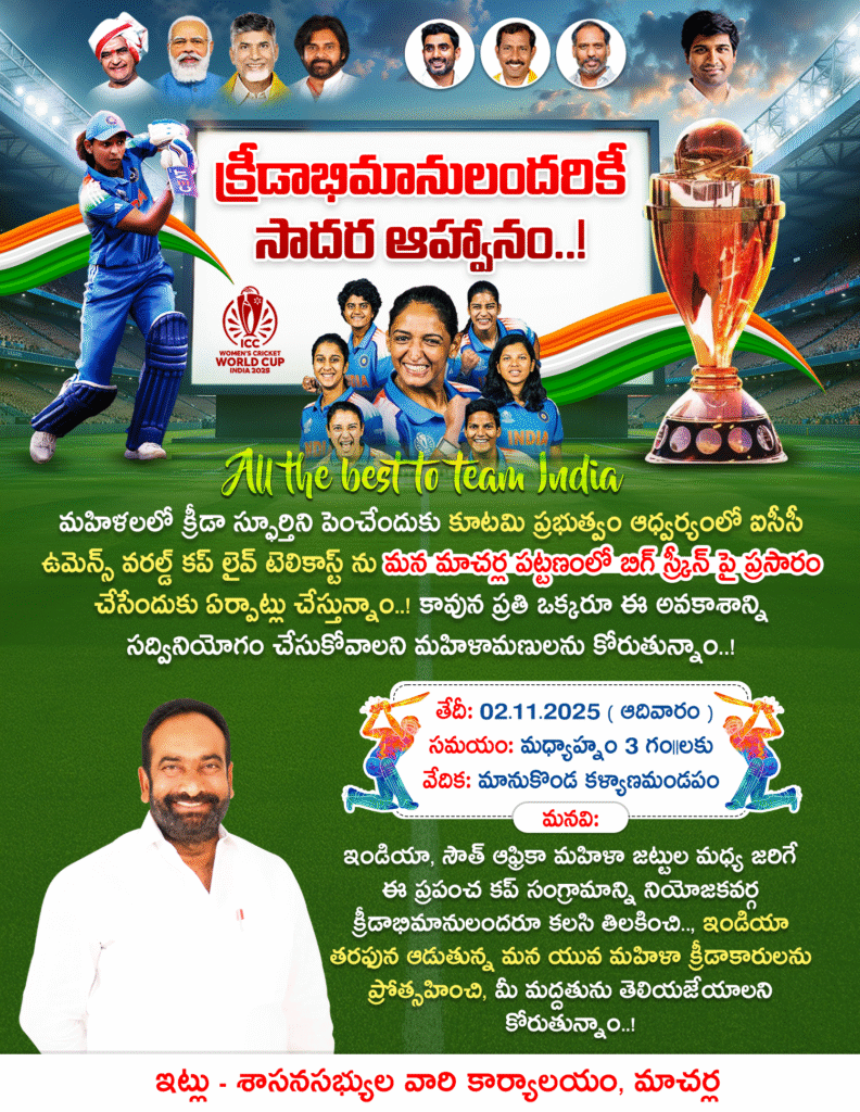 మహిళా ప్రపంచ కప్ ఫైనల్ నేపథ్యంలో ఇండియా,సౌత్ ఆఫ్రికా దేశాల తలబడనున్నాయని, దేశ యువ మహిళా క్రీడాకారులను ప్రోత్సహించేలా, స్థానిక మానుకొండ కళ్యాణ మండపంలో మ్యాచ్ లైవ్ టెలికాస్ట్ చేస్తున్నట్లు వెల్లడించారు. ఈ రోజు మధ్యాహ్నం 3 గంటలకు బిగ్ స్క్రిన్ ఏర్పాటు చేసి,ఈ లైవ్ టెలికాస్ట్ చేస్తున్నామని, క్రీడాభిమానులందరూ ఈ కార్యక్రమానికిి విచ్చే జయప్రదం చేయాలని కోరారు.